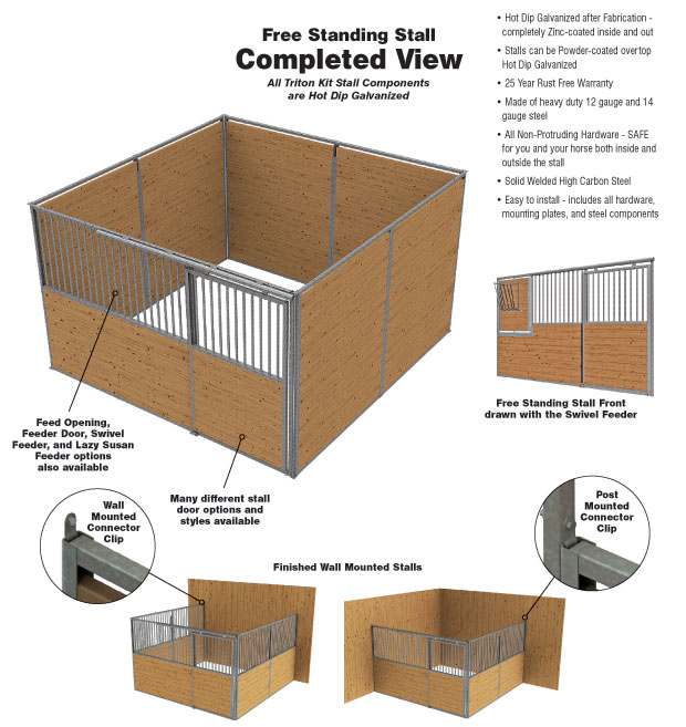 Triton Barn Systems horse stalls are available as: free-standing, front only, 2-sided and 3-sided options. See the horse stall configuration options below.
