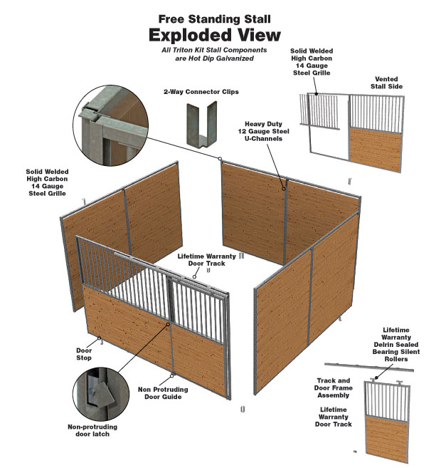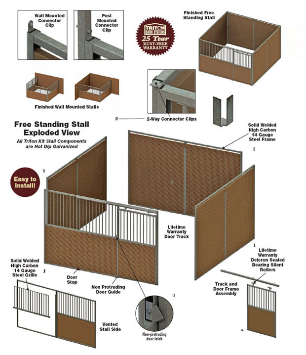 Triton Modular Stalls are designed to allow the user the maximum freedom to set-up different stall configurations while maintaining lowest possible cost. The panels are made to accept 2″ thick lumber, �” plywood or Composite Plate materials.