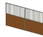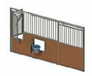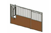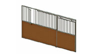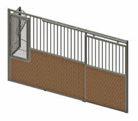 Panel size 116 �” long x 87″ high. For 12′ stalls, 140 1/2 length. Top, Bottom and door frame ends are constructed using 1 �” x 16 gauge square tube. All tubes are punched with 7/16″ round holes to allow assembly of grilles, door track, door stops and door guide. End channels and center door channel are made from12 gauge sheet (.105) thickness and are formed to allow insertion of 2″ lumber. Front grille is 38 �” high and is constructed using 12 gauge channel on the bottom with 7/16″ drainage holes for galvanizing. The bottom channel mounts over the top board creating a “cribbing channel”. Vertical tubes are 1″ x 16 gauge round tubes spaced 4″ on center. Top mounting strap is 3/16″ x 1 �” flat bar with 7/16″ drainage holes for galvanizing and 7/16″ x 1″ slots for mounting grille in frame.