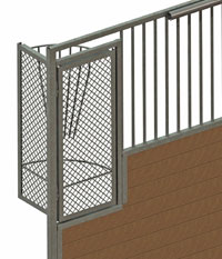 Front grille is 33 �” high and is constructed using 12 gauge channel on the bottom with 7/16″ drainage holes for galvanizing. The bottom channel mounts over the top board creating a “cribbing channel”. Vertical tubes are 7/8″ x 16 ga round tubes spaced 4″ on center. Top mounting strap is 3/16″ x 1 �” flat bar with 7/16″ drainage holes for galvanizing and 9/16″ x 1″ slots for mounting.