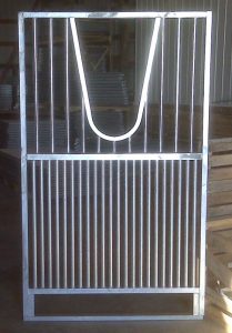 Panel size 116 �” long x 87″ high. For 12′ stalls, 140 1/2 length. Top, Bottom and door frame ends are constructed using 1 �” x 16 gauge square tube. All tubes are punched with 7/16″ round holes to allow assembly of grilles, door track, door stops and door guide. End channels and center door channel are made from12 gauge sheet (.105) thickness and are formed to allow insertion of 2″ lumber. Front grille is 38 �” high and is constructed using 12 gauge channel on the bottom with 7/16″ drainage holes for galvanizing. The bottom channel mounts over the top board creating a “cribbing channel”. Vertical tubes are 1″ x 16 gauge round tubes spaced 4″ on center. Top mounting strap is 3/16″ x 1 �” flat bar with 7/16″ drainage holes for galvanizing and 7/16″ x 1″ slots for mounting grille in frame.