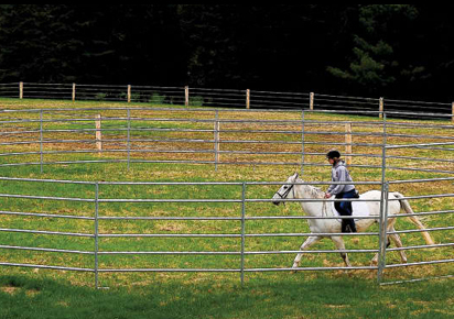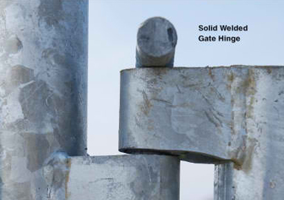 • Panels fit together, each of the 6 horizontal tubular bars has a vertical bolt that drops through a heavy 3/8 inch thick flat tab that is welded to the next panel. The tab is completely hidden inside the tube and is slotted to allow the panel movement from a straight line to a 40 foot radius. The end of each tube is cut to fit so it forms itself around the vertical post both for aesthetics and safety.